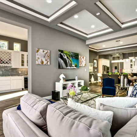 Coffered ceilings, recessed lighting, and luxurious finishes throughout